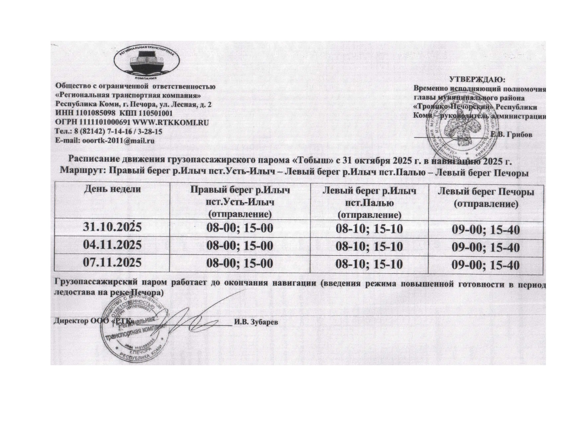 ООО «РТК» сообщает о работе парома «Тобыш» с 31 октября 2025 г. по 07 ноября 2025 г. по новому расписанию при оказании грузопассажирских перевозок, выполняемых по маршруту Правый берег р. Илыч пст. Усть-Илыч – Левый берег р. Илыч пст. Палью – Левый берег Печоры. Новое расписание размещено на сайте ООО «РТК» www.rtkkomi.ru в разделе «Расписание», вкладка «с 31.10.25 паром «Тобыш».